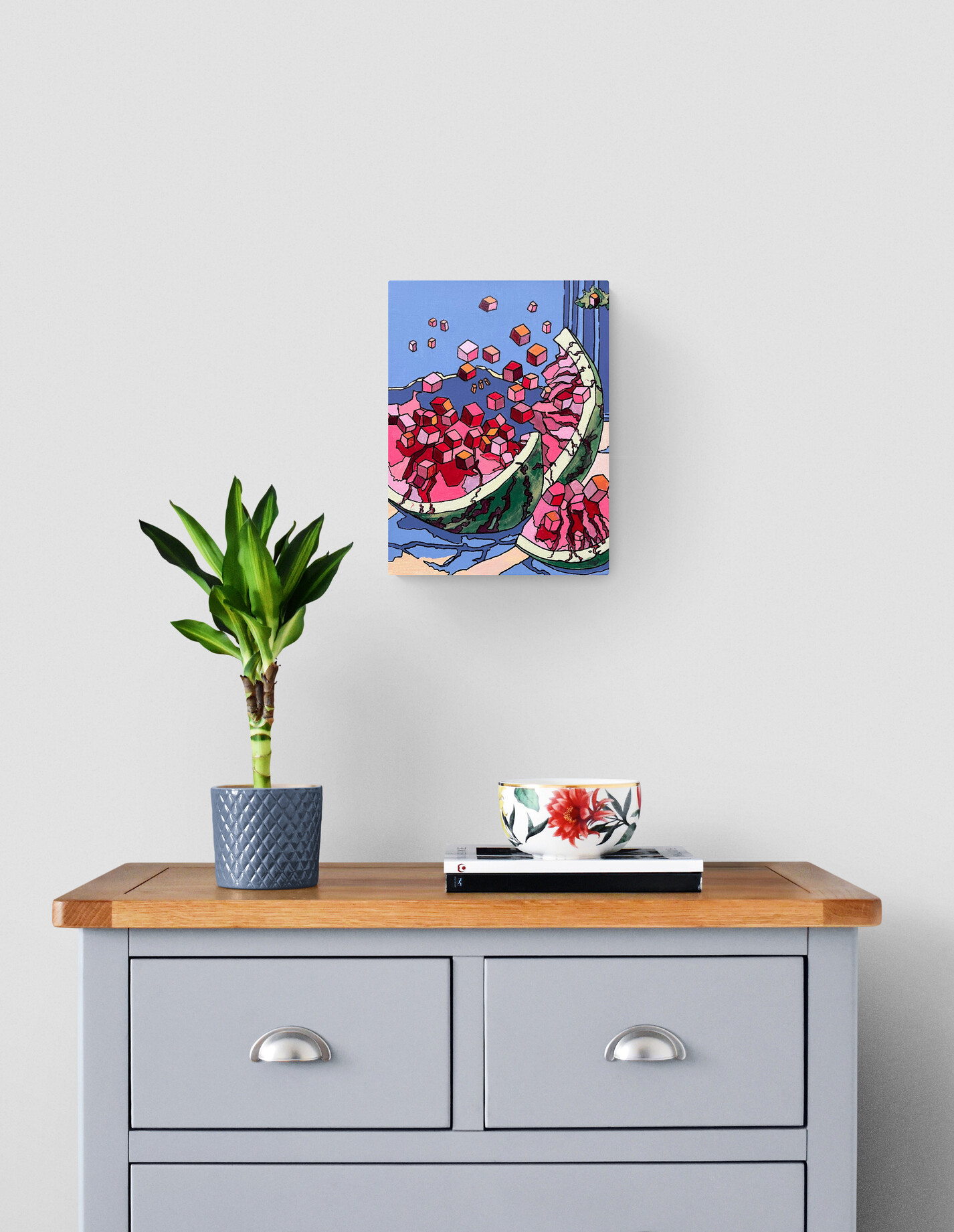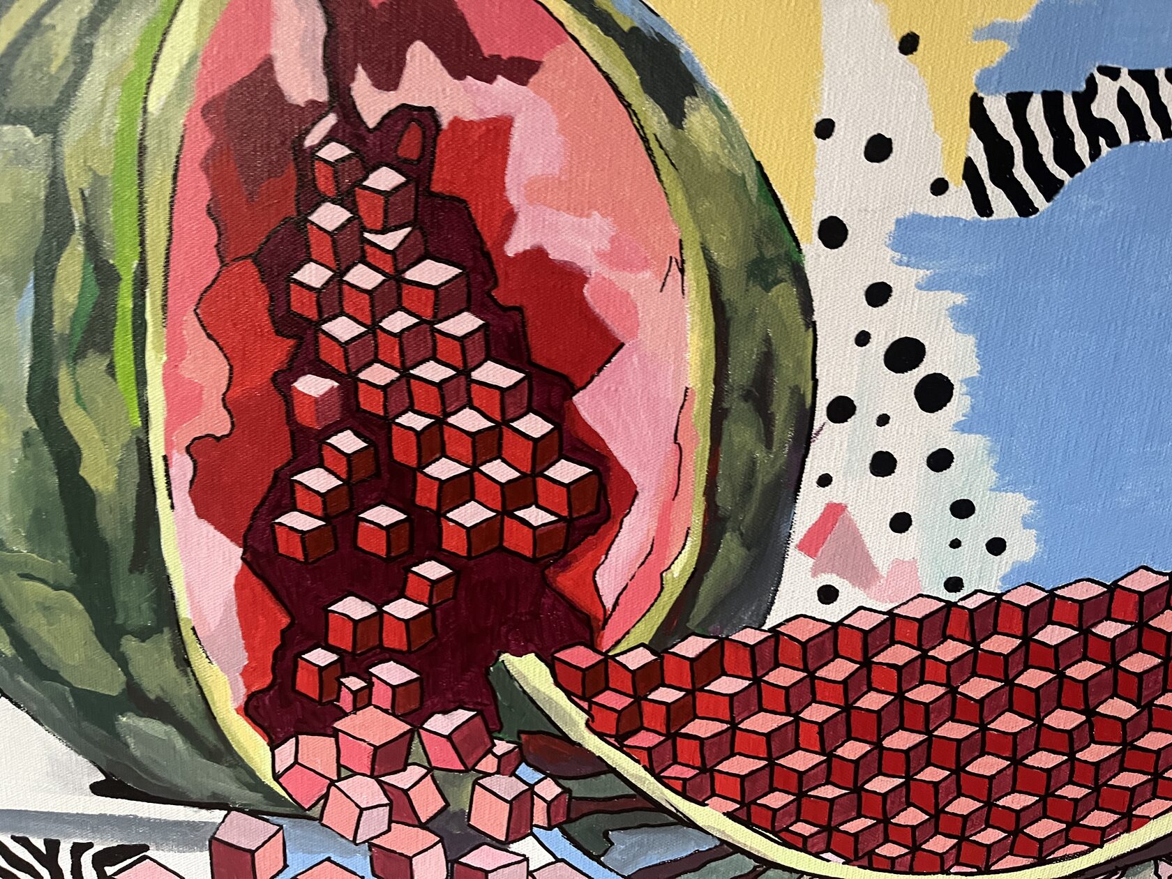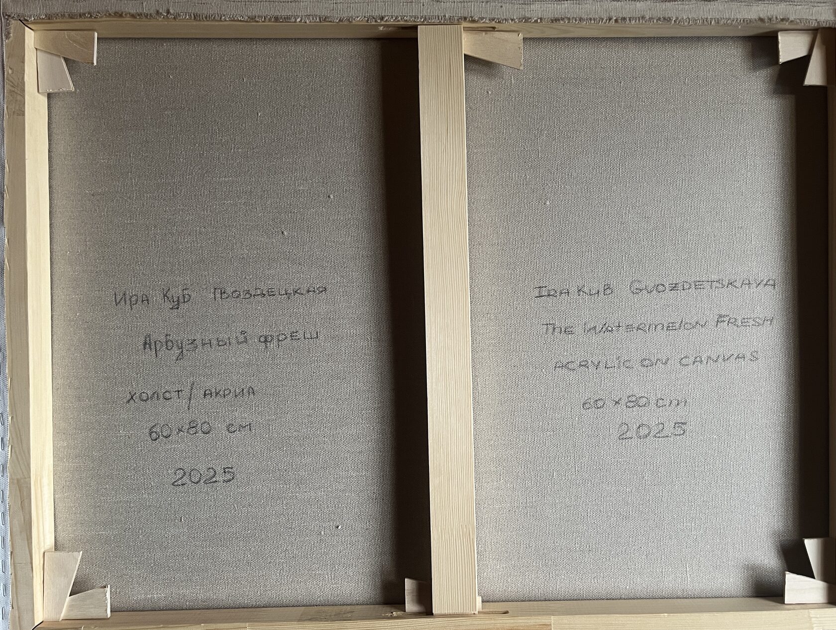 Наша ягодка трещит на разрезе, сок и семечки брызжут в разные стороны, сахарная мякоть дразнит своим летним вкусом. Кусок на тарелке выполнен в традиционной авторской манере, а вот абстрактный фон - что-то новенькое, получилось задорно, весело и декоративно.
