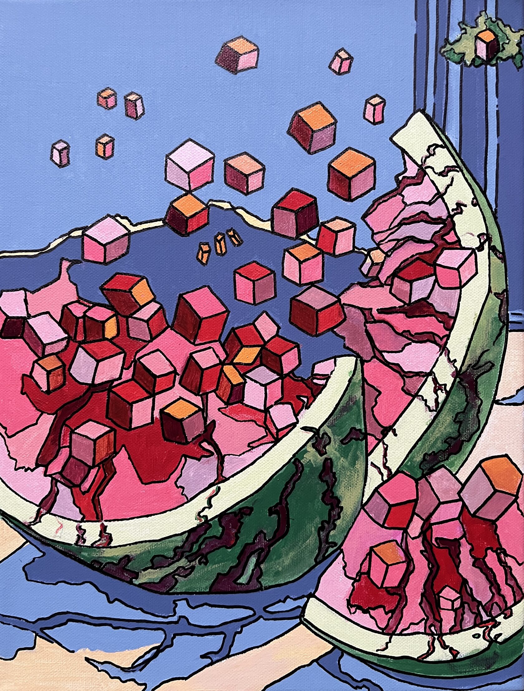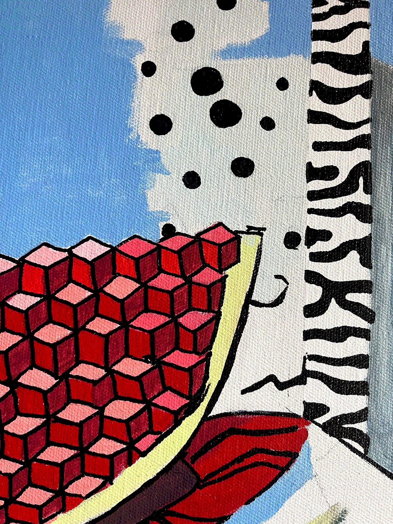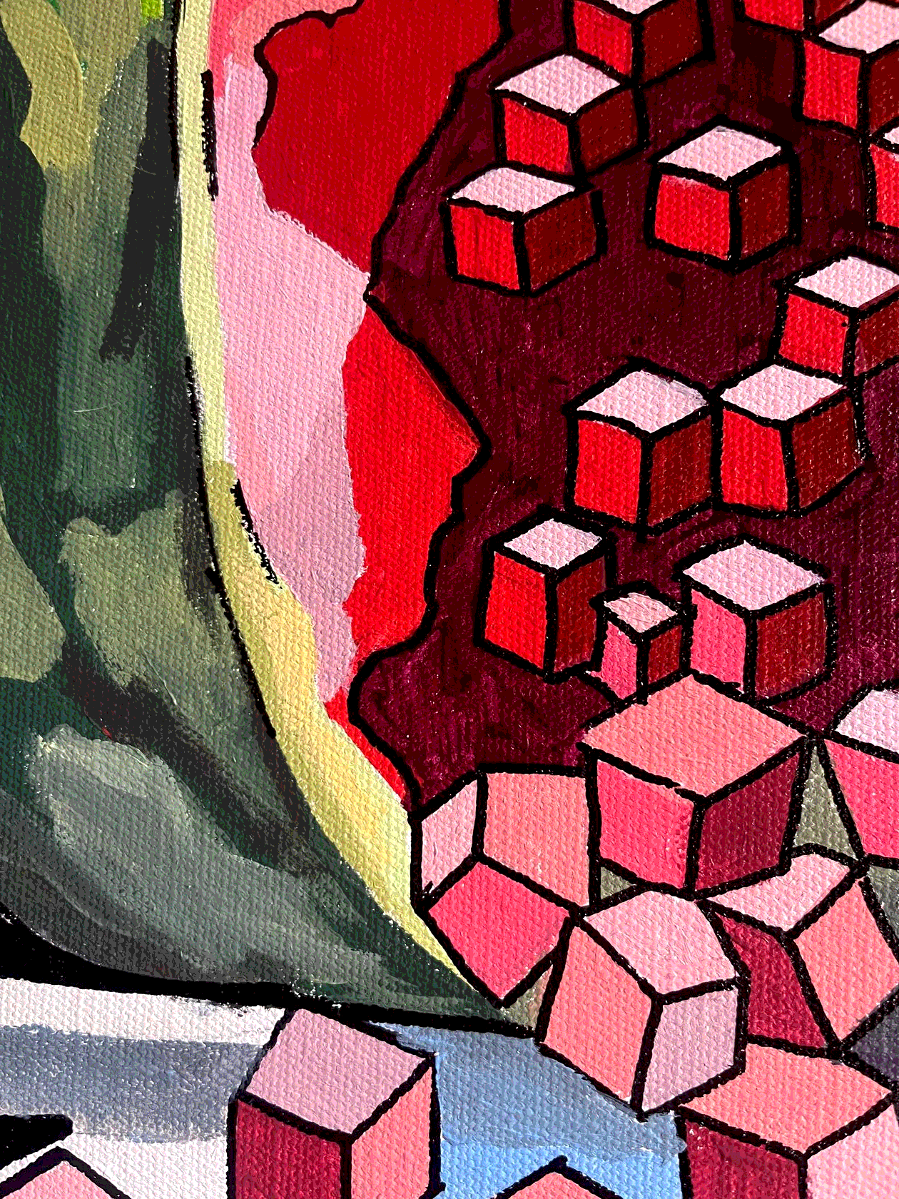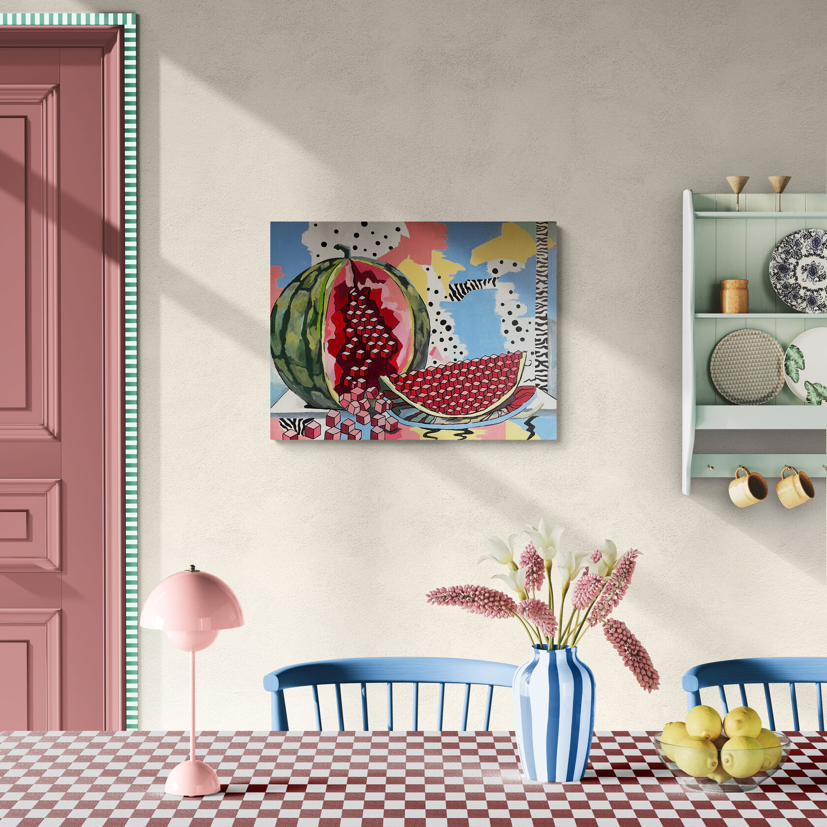Наша ягодка трещит на разрезе, сок и семечки брызжут в разные стороны, сахарная мякоть дразнит своим летним вкусом. Кусок на тарелке выполнен в традиционной авторской манере, а вот абстрактный фон - что-то новенькое, получилось задорно, весело и декоративно.