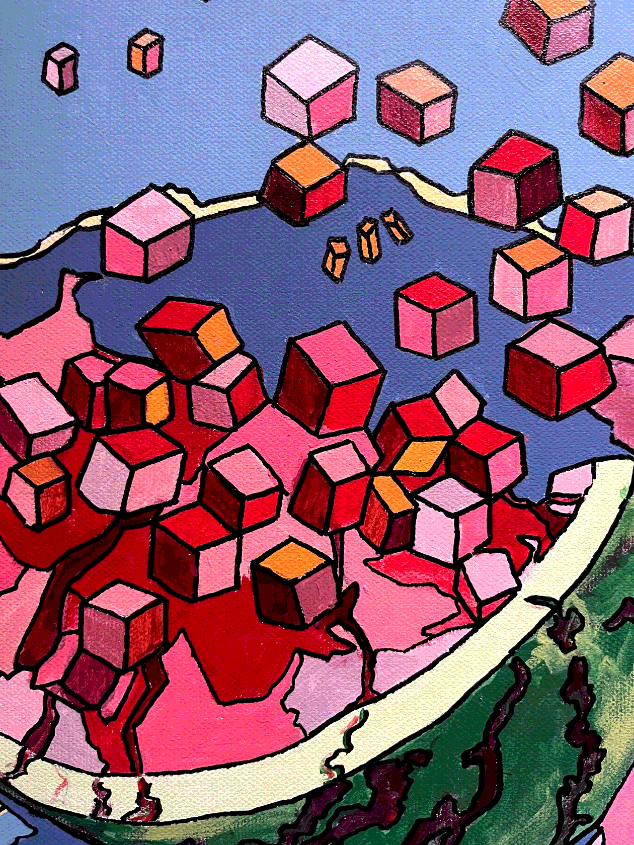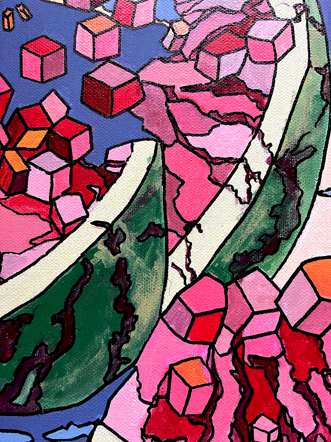 Абстрактная работа - игра с тепло-холодностью. Когда встречаются губы с мороза с домашними тёплыми губами. Они дарят своё тепло, а холод проникает в ответ. Но ненадолго. Через несколько мгновений обоим станет жарко. Картина и греет и охлаждает одновременно. Стройные ряды холода сминают и деформируют мягкое податливое тепло. Но и сами при этом оттаивают и теряют свою кристаллическую структуру. ⠀