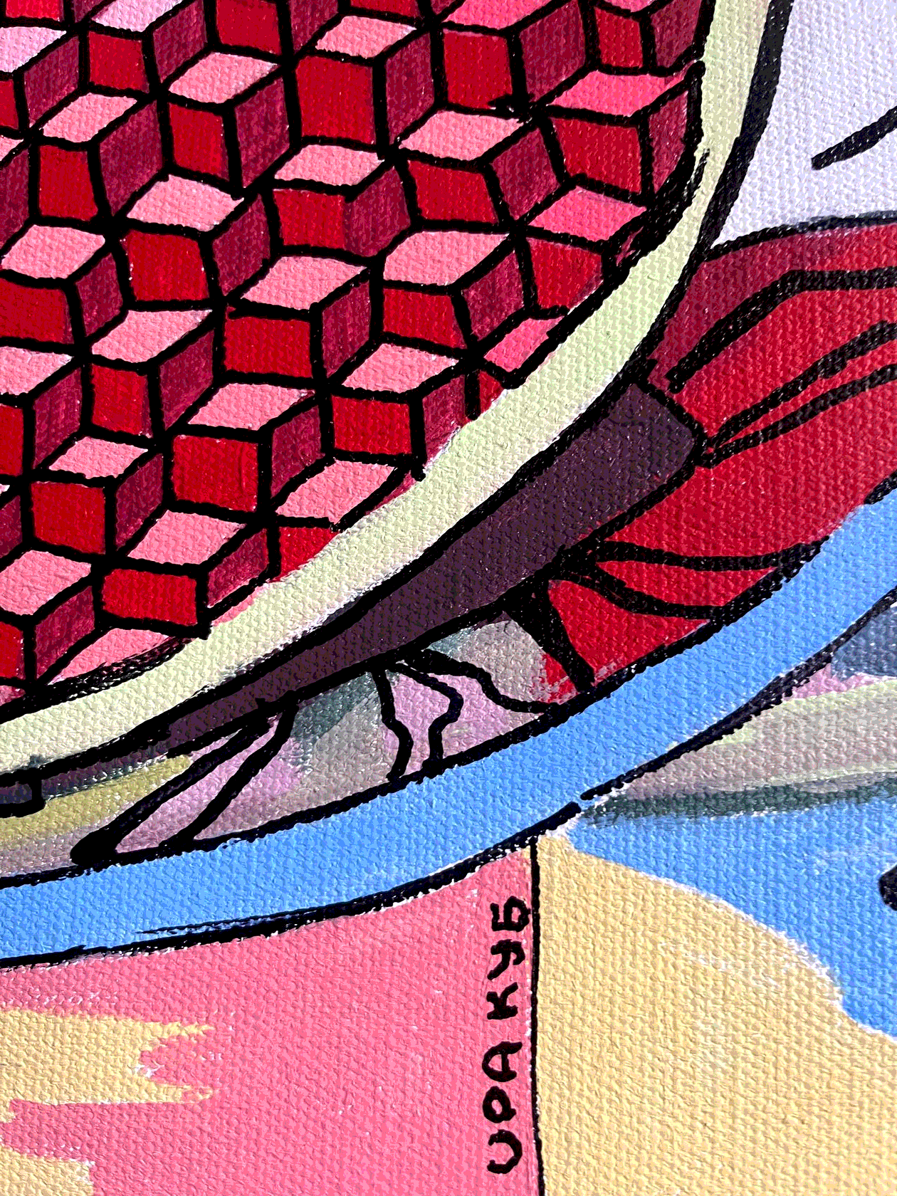 Картина о сильных чувствах, пламенно-красное сердце полыхает на чёрном фоне, кубическая структура подчёркивает идею художника о едином принципе мироустройства, где актор сам решает, чем наполнить и как эмоционально окрасить события своей жизни. Торцы оформлены автором вручную, оформление в багет не требуется.
