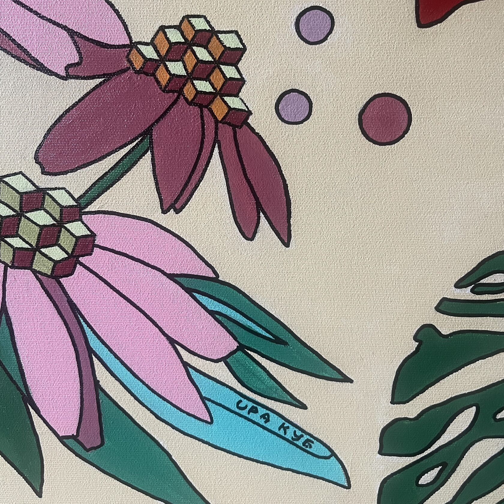 На картине изображена пара прекрасных соцветий космеи, вступивших в немой диалог. Авторские кубики идеально передают сотовую структуру корзинок растения. Торцы оформлены вручную, оформление в багет не требуется.