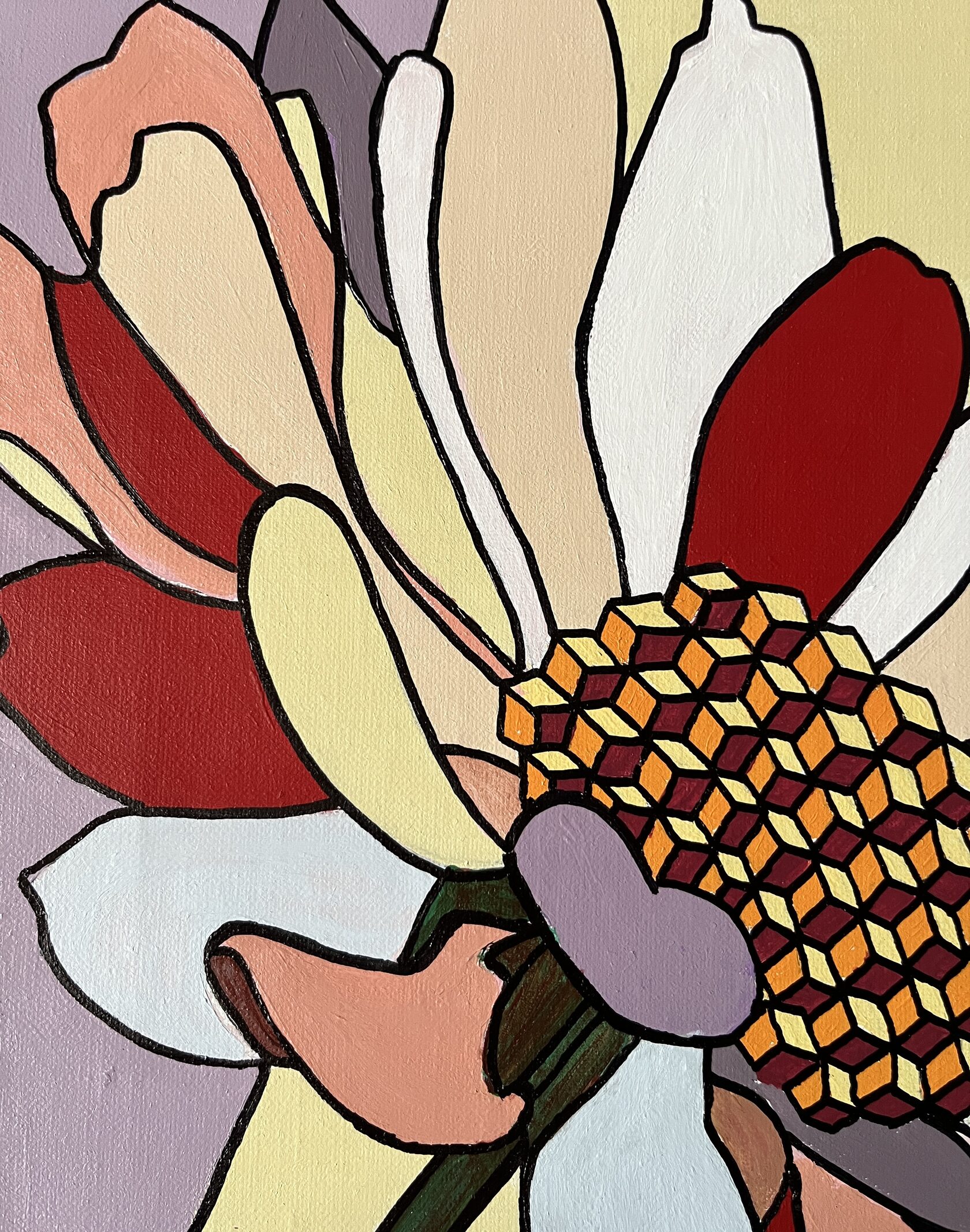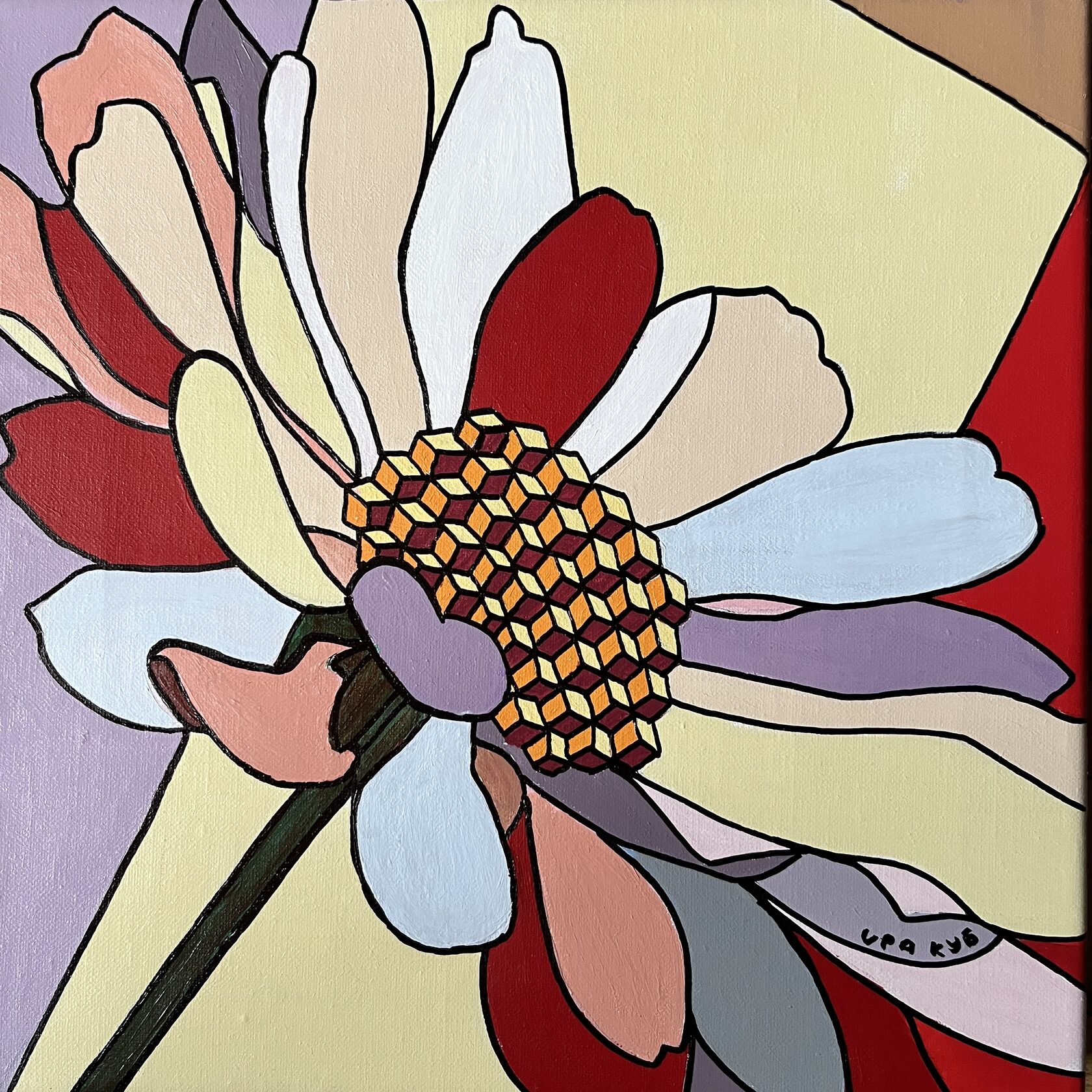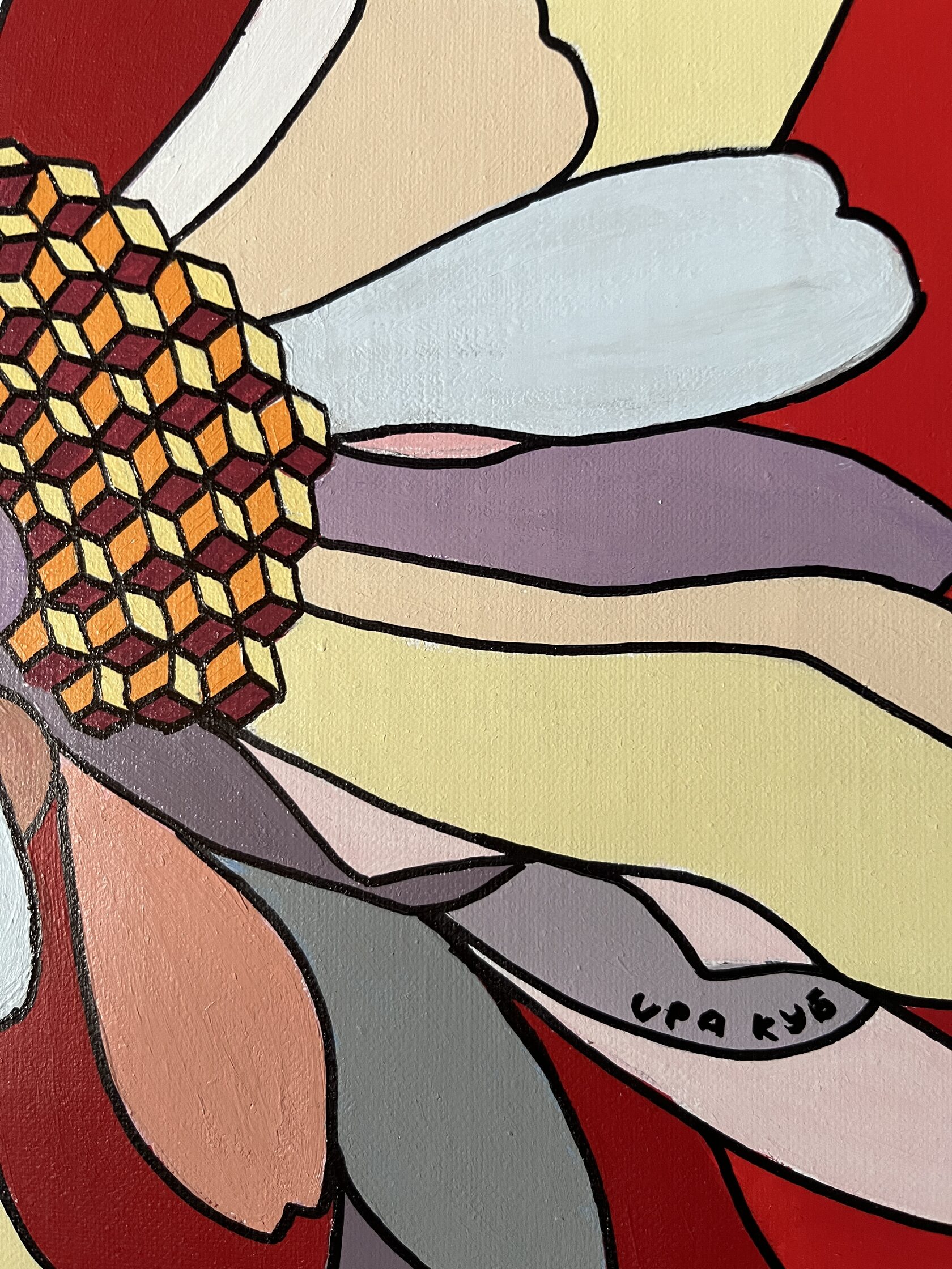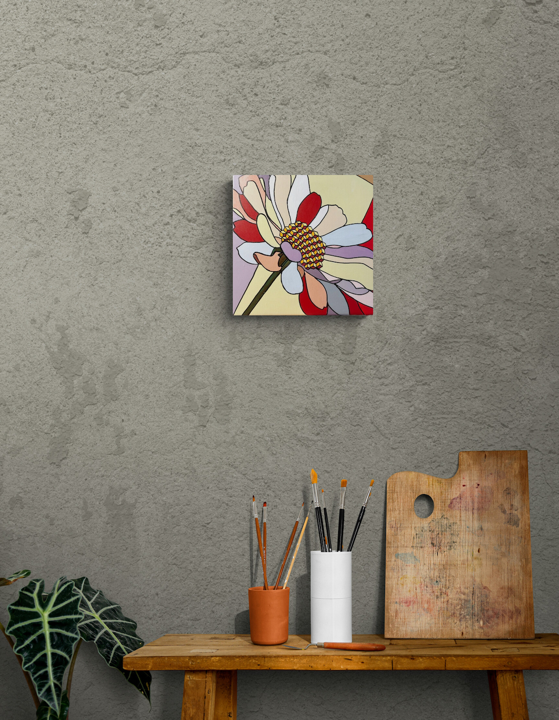 На картине изображен яркий цветок в стилистике поп-арт. Серединка соцветия традиционно собрана из кубиков, что делает авторство безусловно узнаваемым. Мини-формат картины позволяет разместить её в любом интерьере. Картина добавит энергии и тепла в любое пространство. Нежные пастельные голубой и кремовый цвета прекрасно сочетаются с благородным бордо, коралловым и лиловым. Картина станет отличным подарком или началом коллекции искусства.
