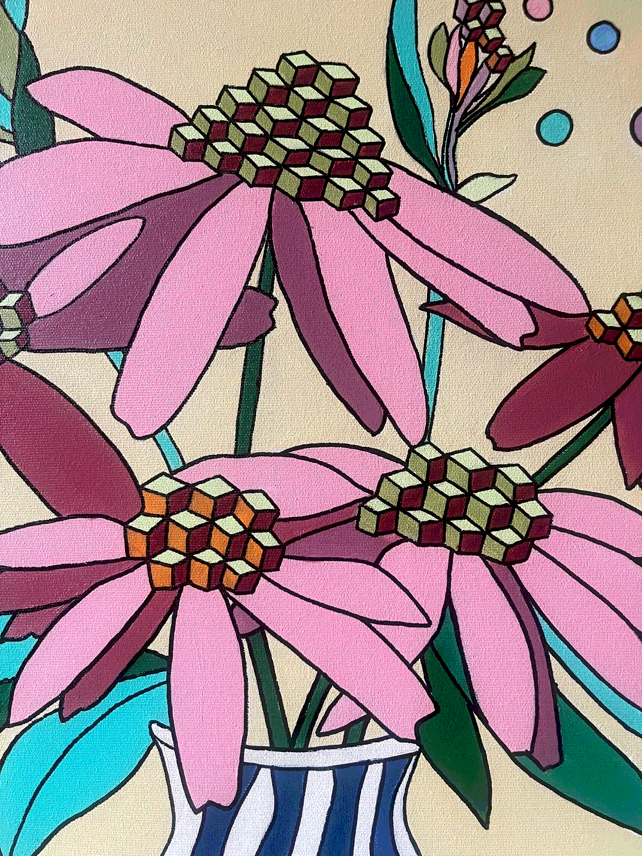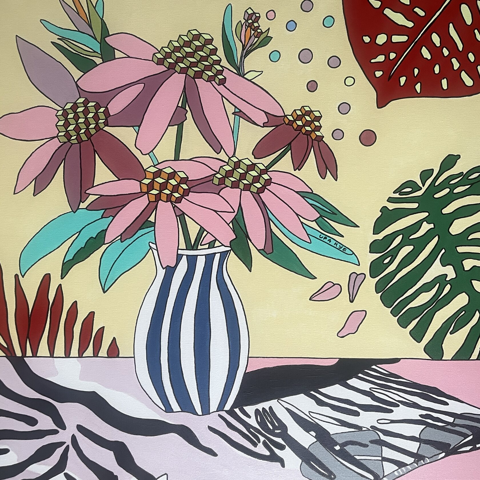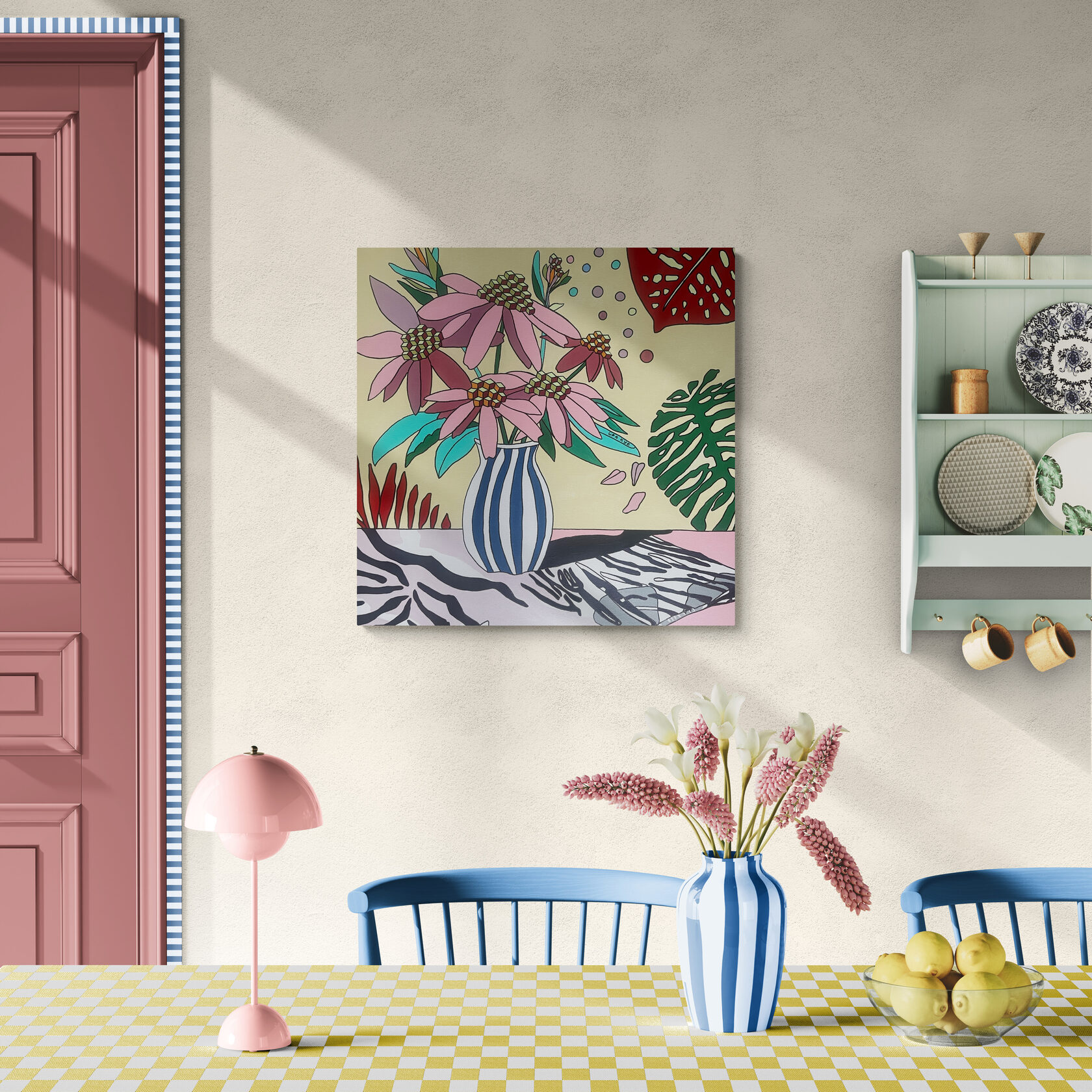 На картине изображен букет розовых ромашек в бело-синей полосатой вазе. На столе салфетка в полосатый паттерн зебры, на кремовом фоне листья тропических растений. Натюрморт выполнен в стилистике поп-арта, который добавляет ощущение наивного детского рисунка. Плоские формы и яркие цвета прекрасно впишутся в интерьер современной гостиной или офиса.