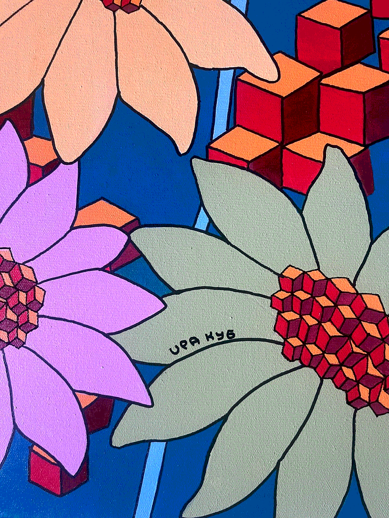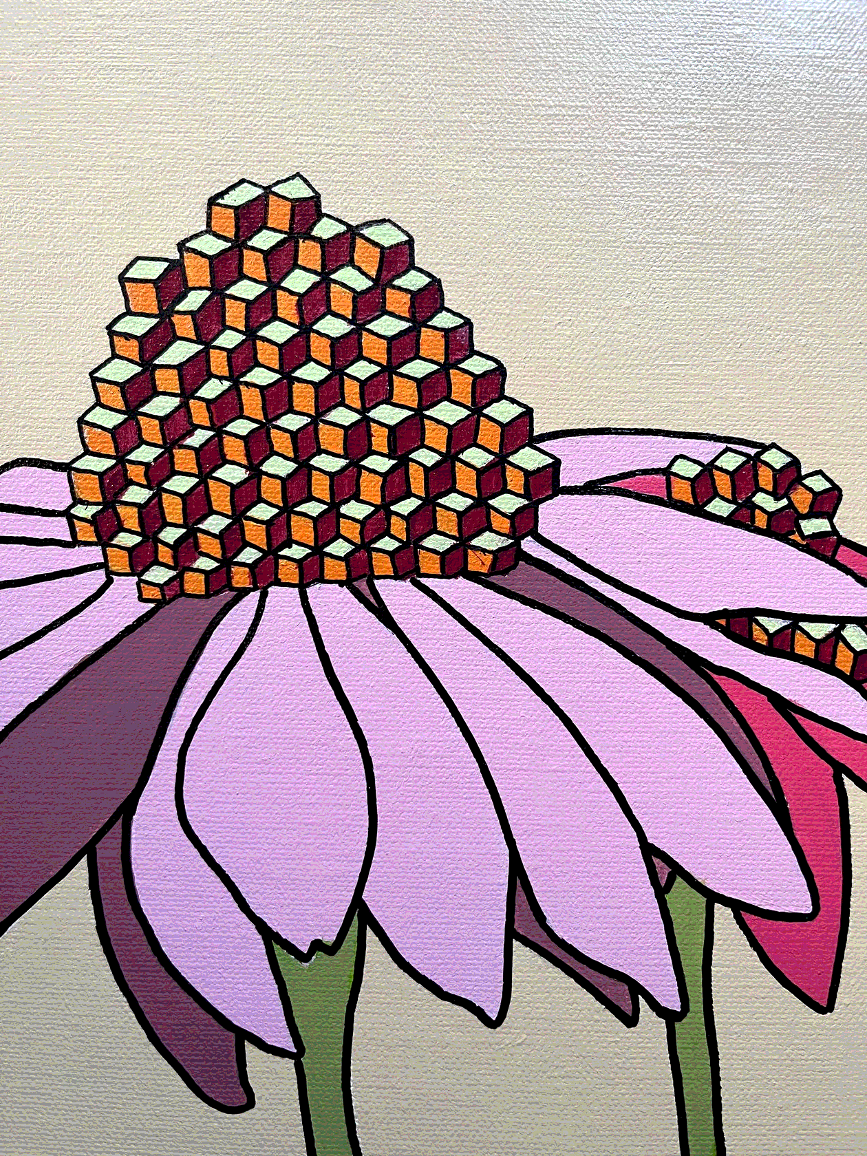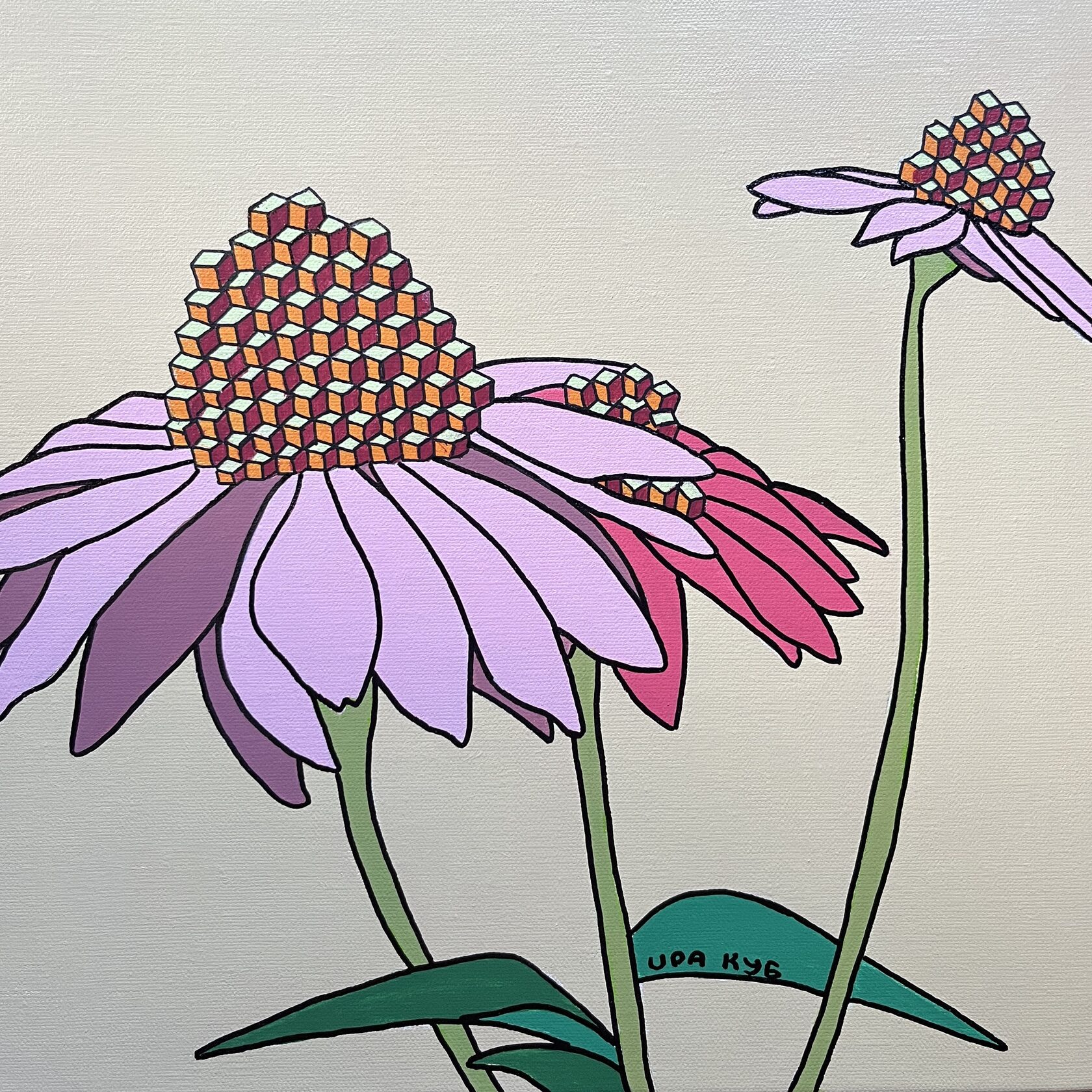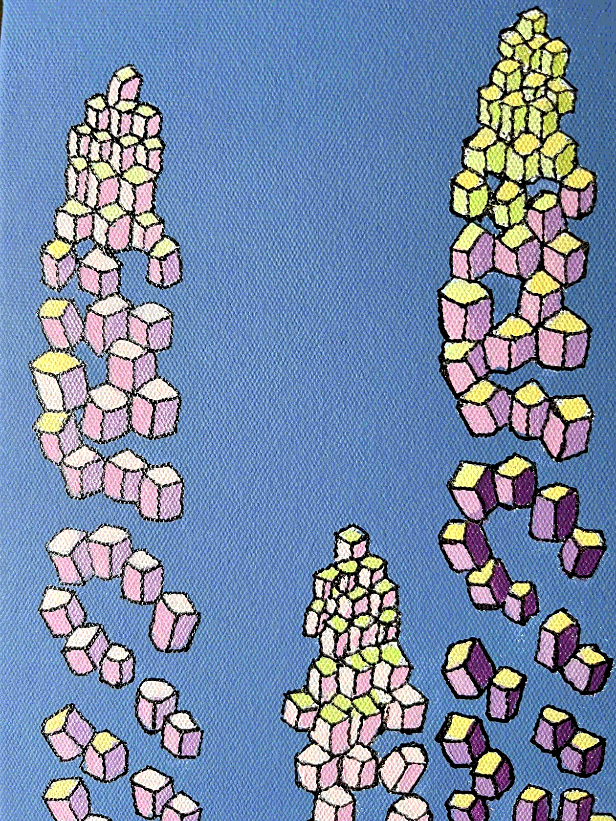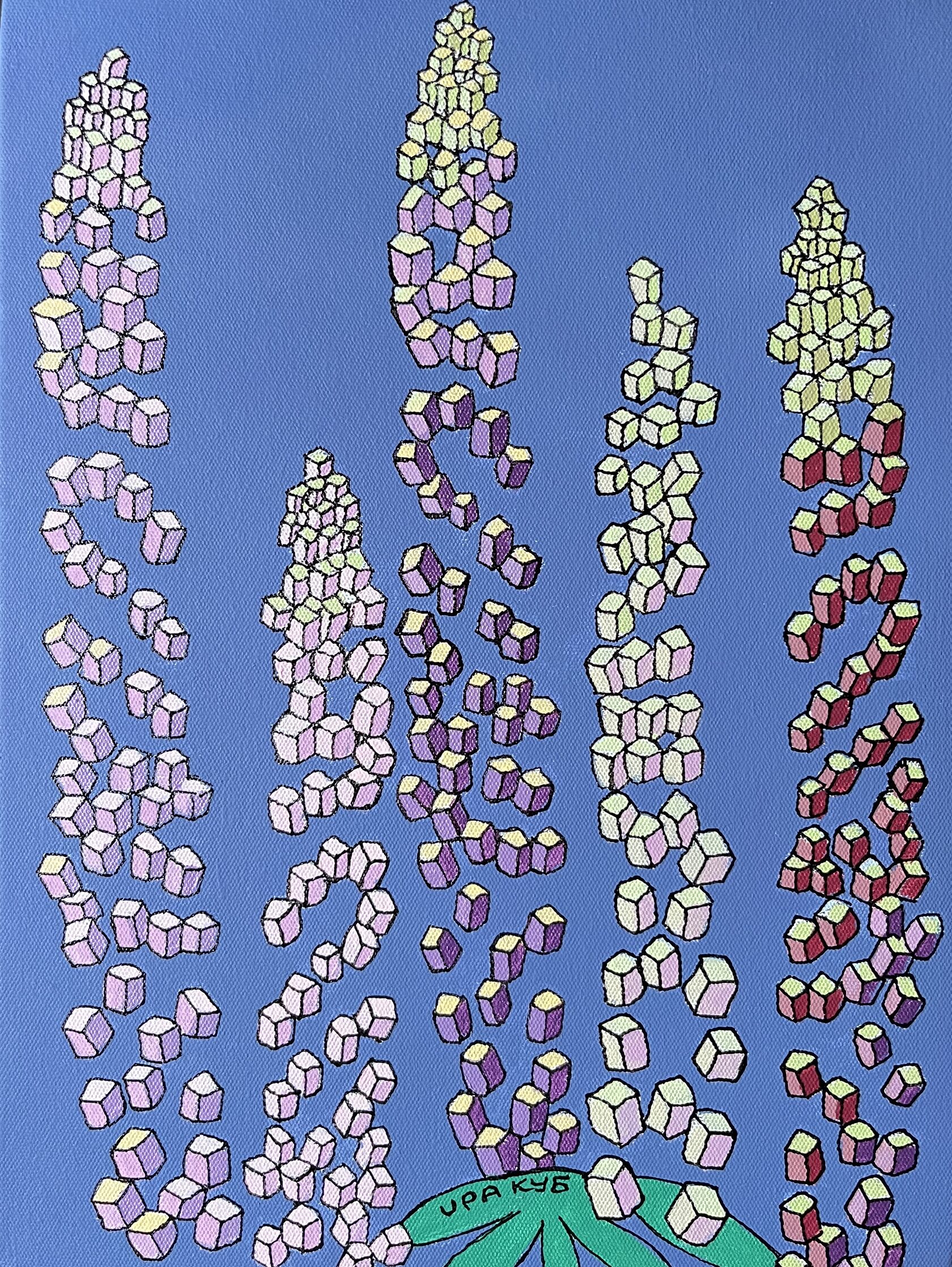 На картине в характерной стилистике поп-арта в нежной розово-лиловой гамме изображены соцветия люпина в виде каскада кубиков. Торцы оформлены автором вручную, оформление в багет не требуется.