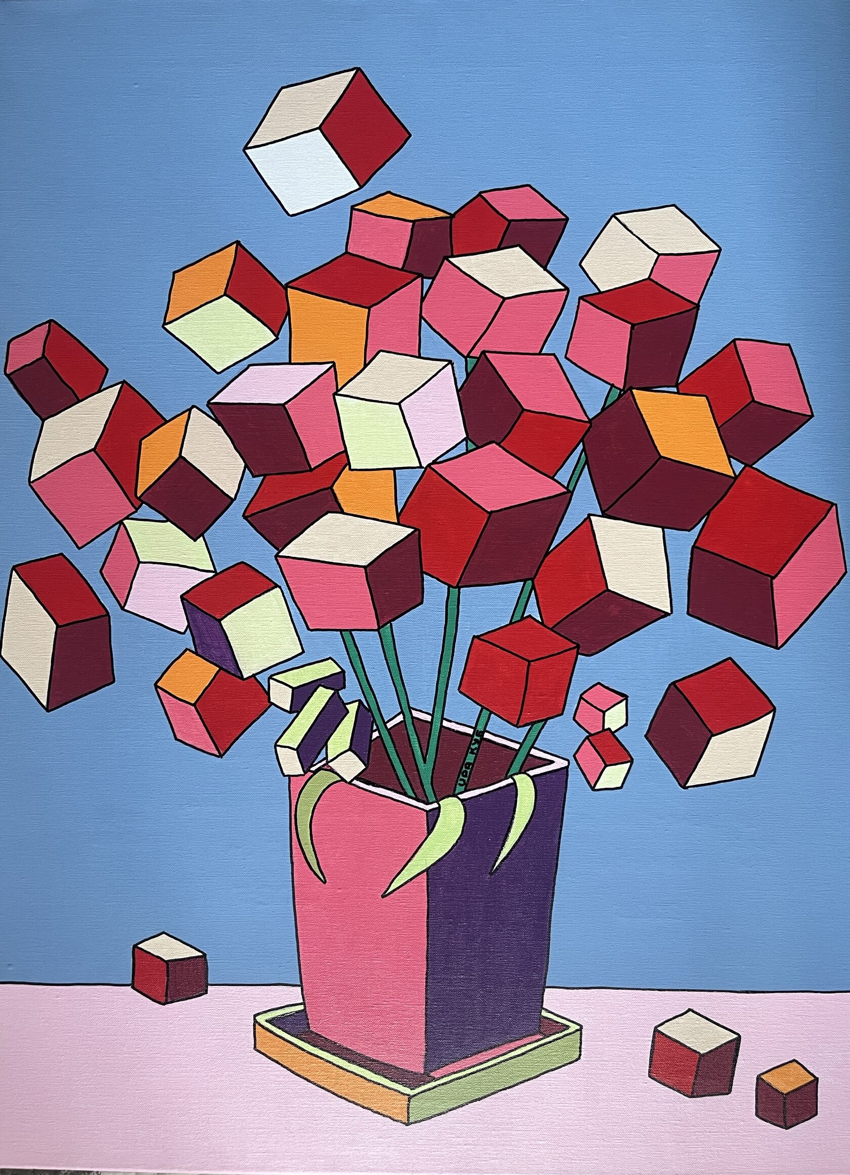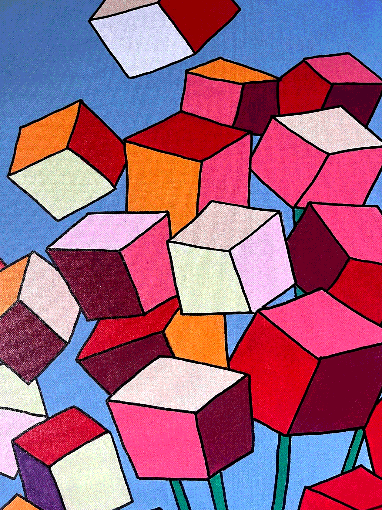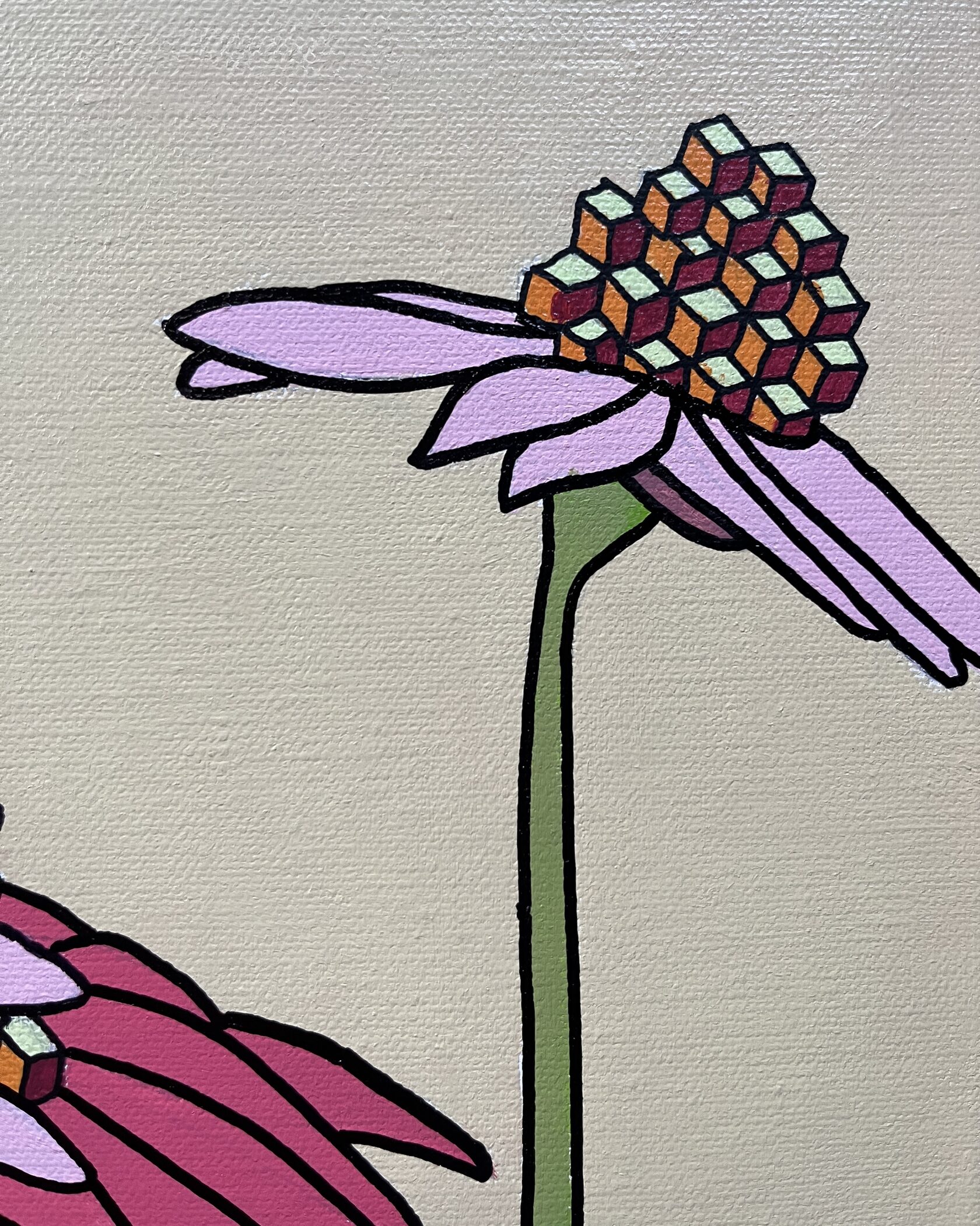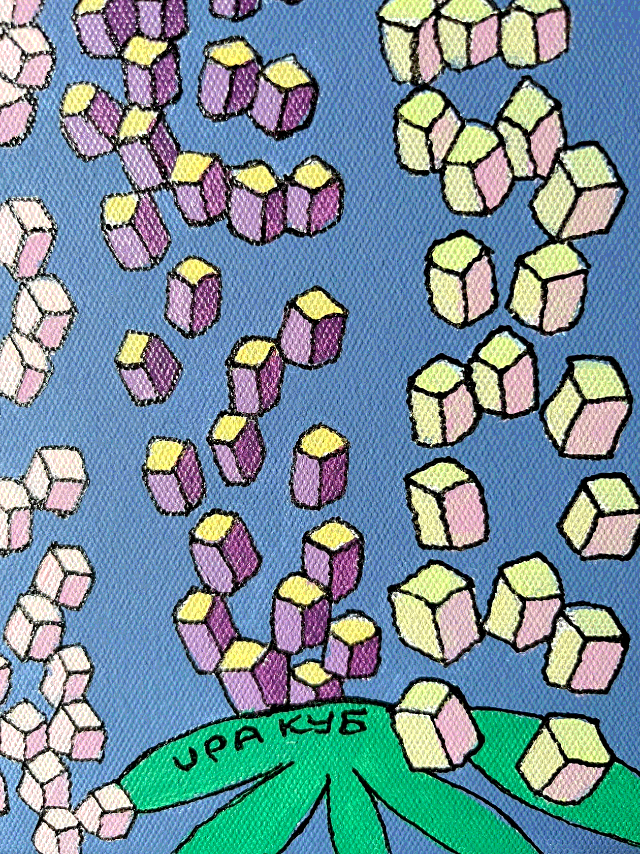 На картине в характерной стилистике поп-арта в нежной розово-лиловой гамме изображены соцветия люпина в виде каскада кубиков. Торцы оформлены автором вручную, оформление в багет не требуется.