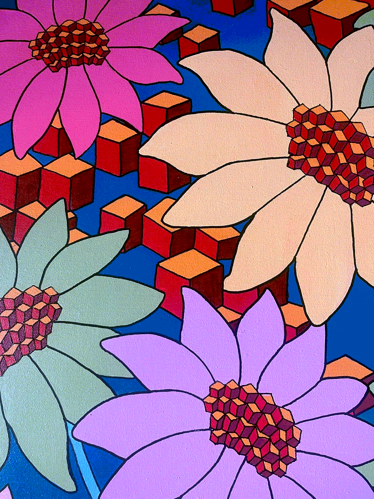 На картине изображена пара прекрасных соцветий космеи, вступивших в немой диалог. Авторские кубики идеально передают сотовую структуру корзинок растения. Торцы оформлены вручную, оформление в багет не требуется.